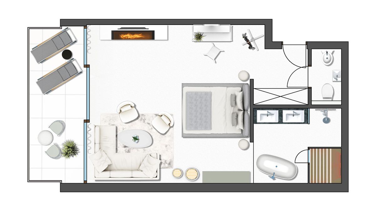 75 m² (inkl. Loggia), für 2 PersonenKingsize-Bett, Wohnecke mit Couch, Flat-TV, Badewanne, Rain-Shower & Bidet, Nespresso-Kaffeemaschine & Teestation, Minibar, Steinboden, private Sauna und Blick auf den Garten.