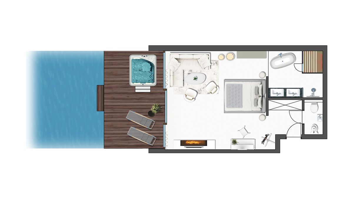 80 m² (inkl. Loggia), für 2 Personen.Kingsize-Bett, Wohnecke mit Couch, Flat-TV, Badewanne, Rain-Shower & Bidet, Nespresso-Kaffeemaschine & Teestation, Minibar, Steinboden, Whirlpool, private Sauna, Blick in den Garten und eigenem Einstieg in den Naturbadesee.
