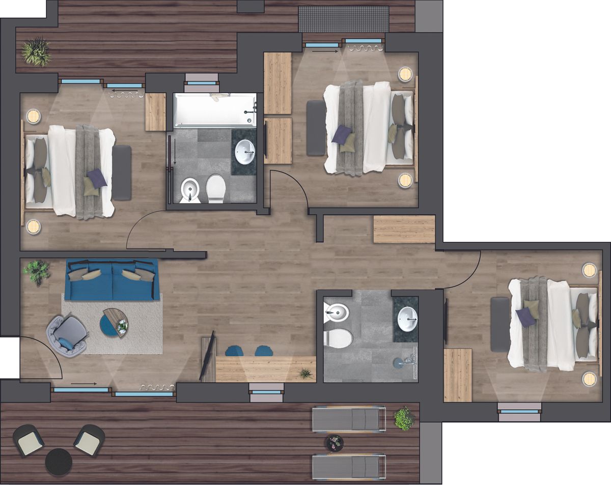 Ca. 90 m², für 2–8 Personen, 3 Doppelzimmer mit Box-Springbetten, 2 Badezimmer mit großzügiger Dusche, großer Wohnraum mit Schlafsofa, TV im Zimmer inkl. Wohnzimmer, Minibar, Nespresso-Kaffeemaschine & Teestation, Klimaanlage, Holzboden und großzügiger Terrasse (im Parterrebereich).Die Family-Suite liegt in der Residenz (Dependance), ca. 50 m vom Hotel entfernt und ist über den Außenbereich erreichbar (keine unterirdische Verbindung).